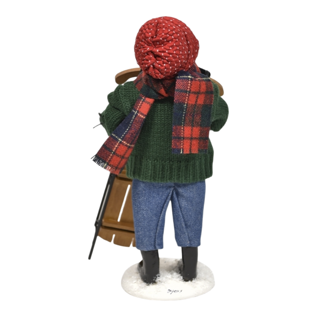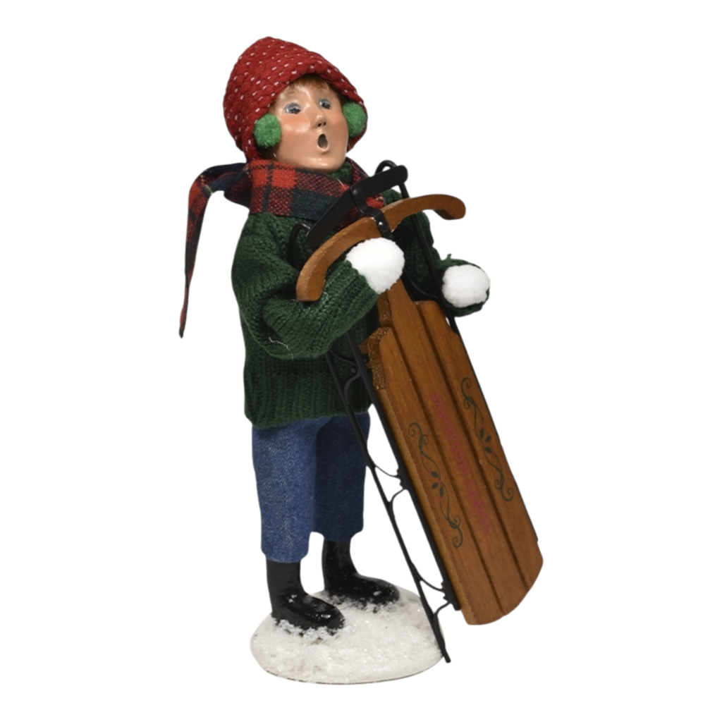 Invite the thrill of winter fun into your home with the enchanting Winter Sports Family - Sledding Boy figurine! Standing at a delightful 10 inches tall, this charming Byers’ Choice collectible captures the joyful essence of snowy adventures. Dressed warmly in a cozy green jacket, matching hat, and earmuffs, this spirited boy is ready for a day of sledding excitement. With his sled in hand and a cheerful expression on his face, he embodies the excitement and playful spirit of winter sports.