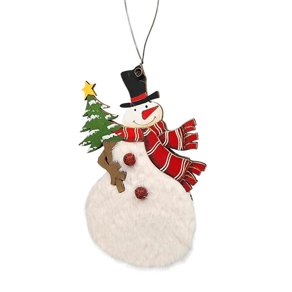 Embrace the festive season with this delightful wooden snowman ornament, standing 5 inches tall and enhanced with soft, fluffy fur. This charming snowman, adorned with a red and white striped scarf and a classic black top hat, brings a joyfully nostalgic touch to your holiday decor. Carrying a Christmas tree topped with a yellow star, he encapsulates the spirit of the season, spreading warmth and cheer.