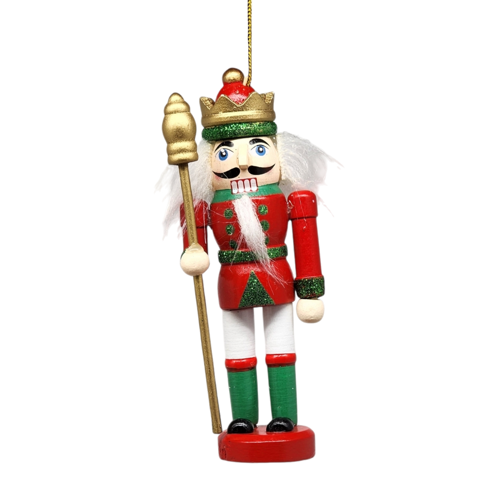 Elevate your holiday decor with our charming 5-inch nutcracker ornament, featuring a regal design complete with a golden crown and staff. Dressed in vibrant red and green, this captivating figure embodies the festive spirit, making it a delightful addition to your Christmas tree or holiday displays. With intricate details and a joyful expression, he captures the essence of the season, perfect for spreading cheer.