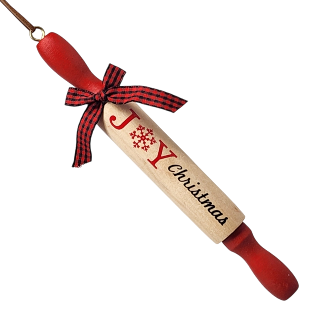 Bring some holiday cheer to your decorations with this delightful rolling pin ornament! Standing just over 8 inches tall, this charming piece features a playful design with the whimsical phrase "Joy Christmas" Topped with a bright red handle and accented with a festive checkered bow, it captures the essence of cozy winter baking traditions and the joy of the season.