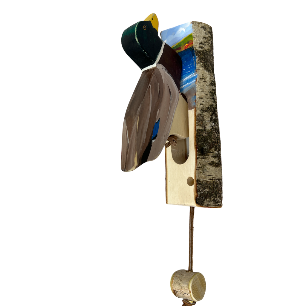 Welcome guests with the vibrant colors of the great outdoors using this hand-carved Mallard Wooden Door Knocker, expertly crafted by Vermont artist Terry Borsman. This charming piece features a meticulously painted pine Mallard duck, mounted on a birch bark base that retains the natural texture of the bark and includes a scenic landscape painting. The door knocker is complete with a sturdy leather cord and a birch twig pull knob, combining rustic aesthetics with functional design. Finished with a protective polyurethane coating, it’s designed to resist weathering and add lasting beauty to your entryway.