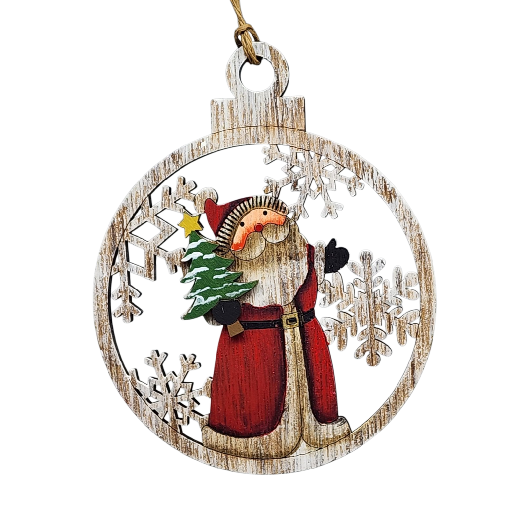 Spread holiday cheer with our delightful Cheerful Santa with Christmas Tree Ornament! Measuring approximately 5.5 inches by 4.5 inches, this charming laser-cut wooden ornament features a jolly Santa Claus donning his classic red suit, complete with a festive green Christmas tree in hand. Surrounded by beautiful snowflakes, this hand-painted ornament captures the warmth and excitement of the holiday season, making it a perfect addition to your Christmas tree or seasonal decor.