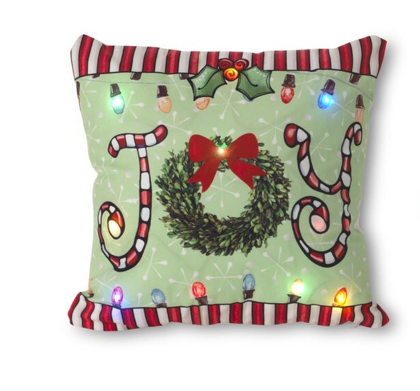 - Add holiday cheer to your home with our 16-inch Lighted Holiday "JOY" Design Pillow, featuring a festive wreath with a vibrant red bow.