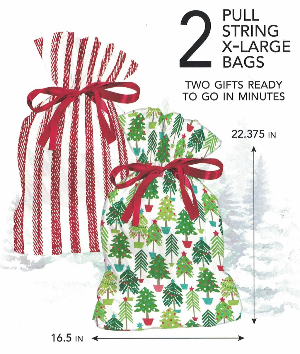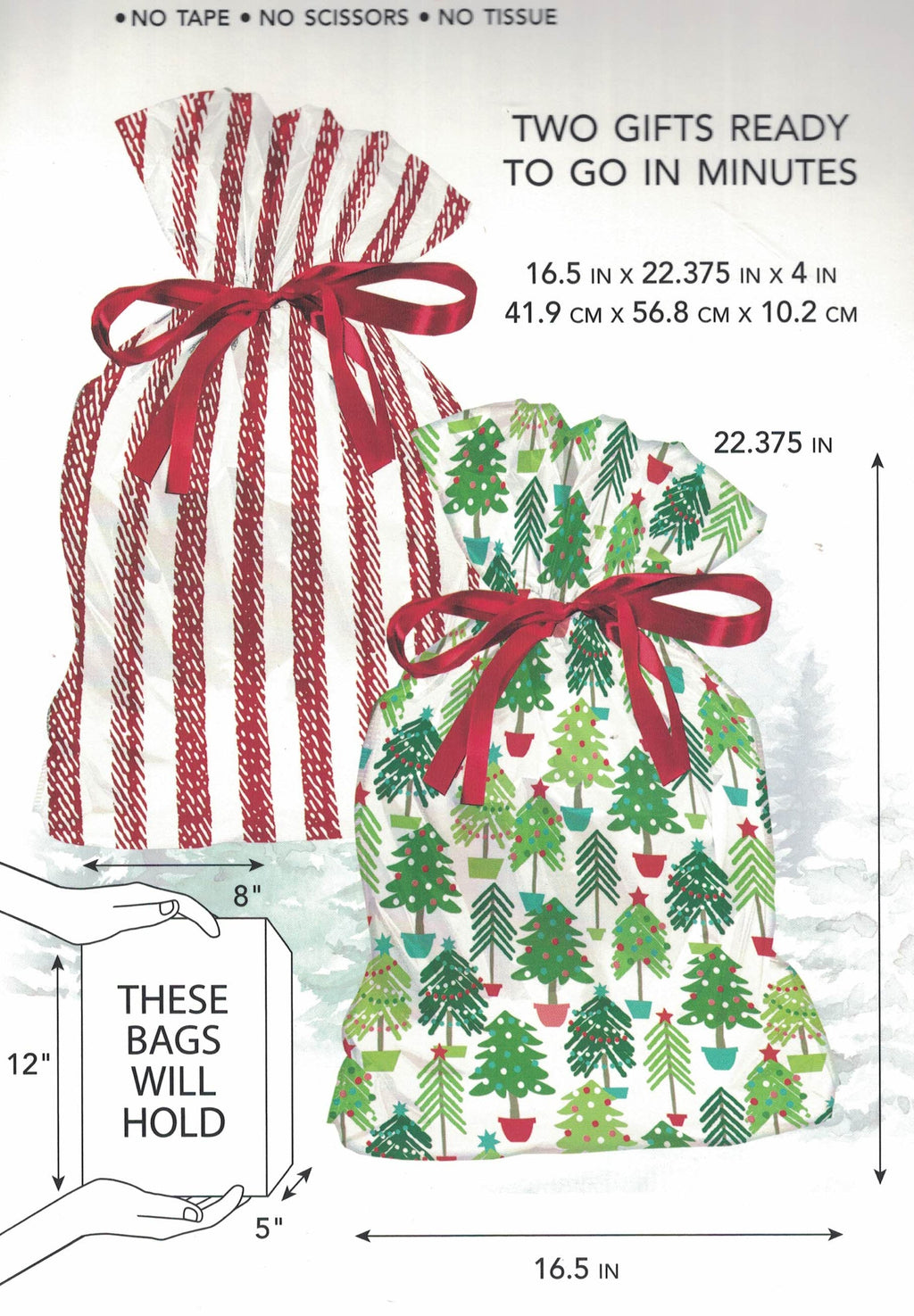 Just making life as easy as we can. 2 Extra Large Bags with built in drawstrings. Three minutes and your gifts are ready to go!