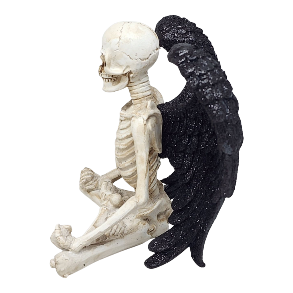 Meet the ultimate Halloween yogi with a spooky twist! This striking Yoga Skeleton Figurine is masterfully crafted, featuring a meditative skeleton sitting calmly in the classic Lotus Pose, known as Padmasana. This cross-legged pose is celebrated in yoga for promoting relaxation and improving posture, perfect for anyone craving inner peace—whether in life or the afterlife! With its striking black resin wings spreading behind the skeleton, it strikes an eerie yet serene figure that fits perfectly in a Halloween or Day of the Dead display.