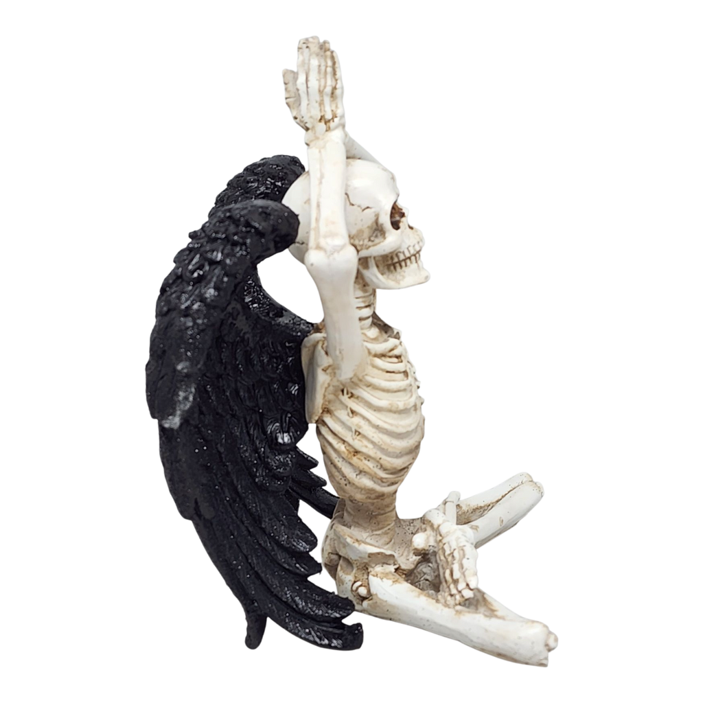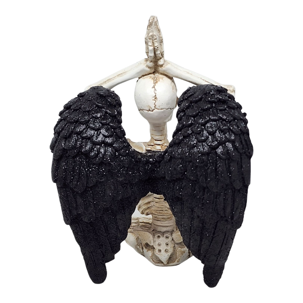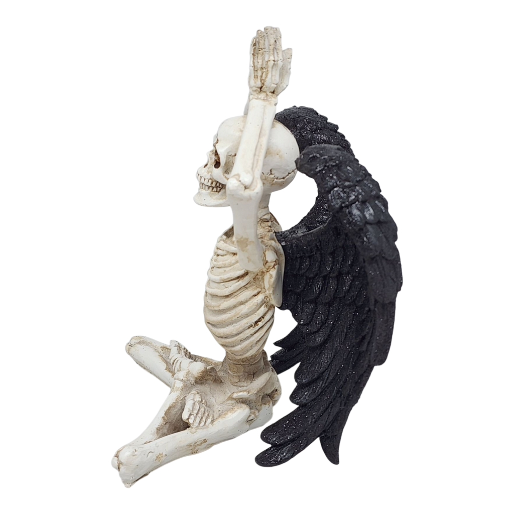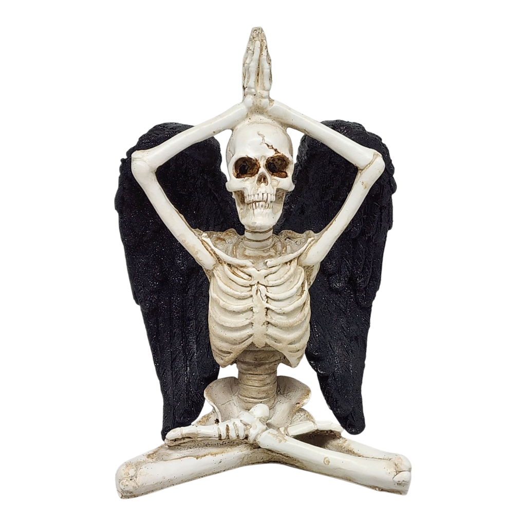 Bring a bone-chilling twist to your yoga space or Halloween decorations with this captivating resin skeleton figurine! Sitting serenely in the Lotus Pose, also known as Padmasana, this skeletal yogi is the perfect blend of spooky and serene. The figurine features a classic cross-legged lotus posture with hands pressed together overhead in a prayer mudra, embodying calm and focus—even in the afterlife. Adorned with detailed black wings, it adds an angelic or gothic flair that makes it a unique piece for anyone who loves yoga, skeletons, or just a touch of the supernatural.