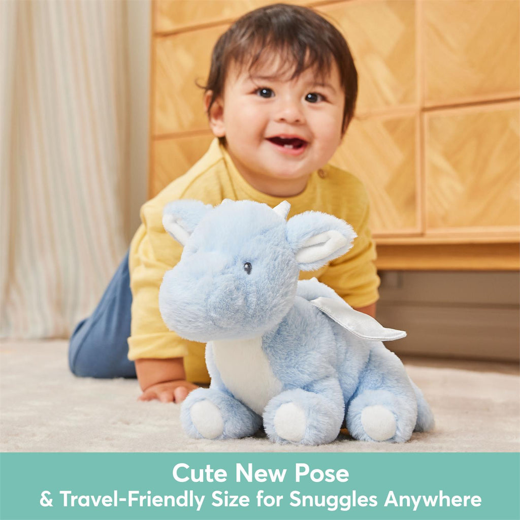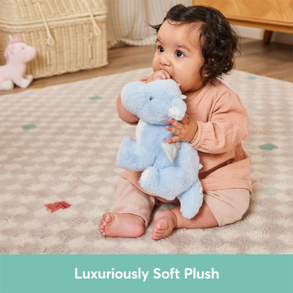 - ZEPHIE DRAGON PLUSH: This adorable, floppy 10 inch baby-blue dragon relaxes in a playful pose, ready to snuggle or snooze with baby. Zephie features embroidered details, super-soft fabric, and silver satin spines, horns, and wings for tactile play.